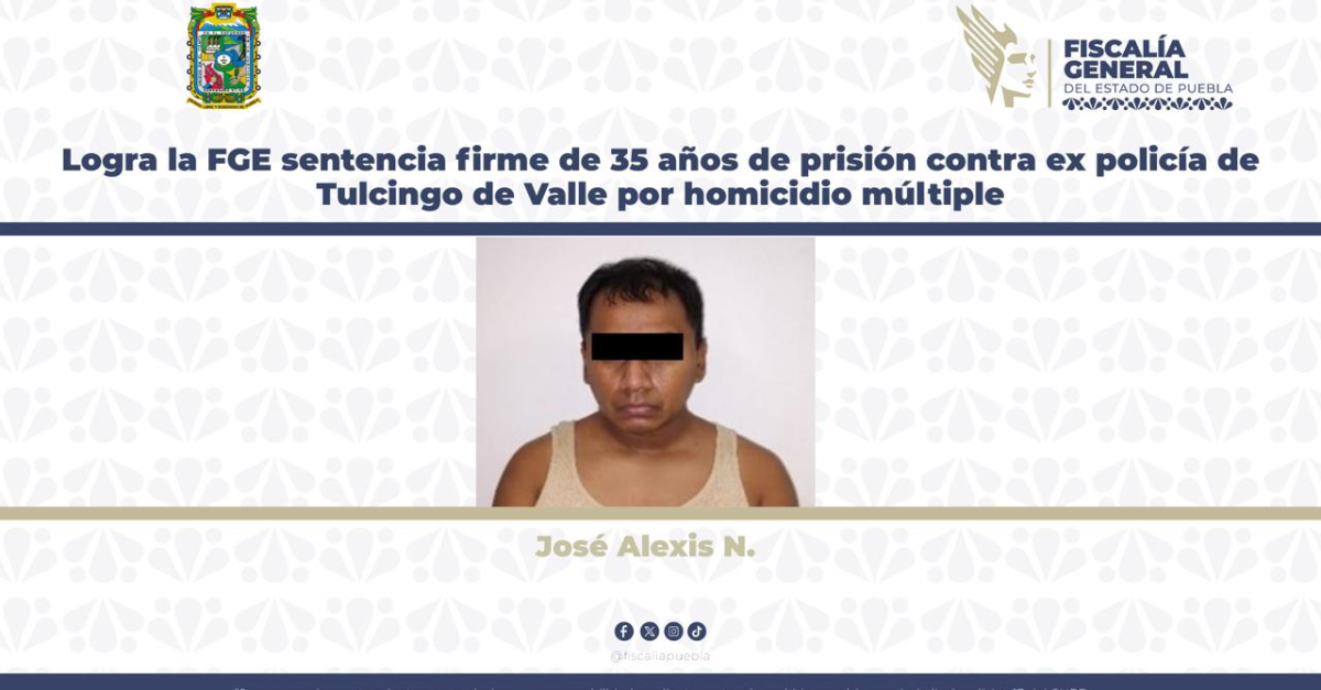 La Fiscalía General del Estado logró que quedara firme la sentencia de 35 años de prisión contra José Alexis N., ex policía municipal de Tulcingo de Valle, tras acreditarse su responsabilidad en el homicidio calificado de cuatro personas.