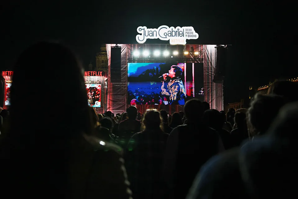 El concierto, que mostraba a Juan Gabriel con su emblemático traje de lentejuelas doradas y negro, acompañado por la Orquesta Sinfónica Nacional de México, fue presentado en pantallas gigantes como parte de la promoción de la serie documental “Juan Gabriel: Debo, puedo y quiero”, dirigida por María José Cuevas. La producción, disponible en Netflix, ha ocupado el primer lugar en México y el sexto a nivel global en la plataforma, con 1.8 millones de visualizaciones y 7.4 millones de horas vistas.