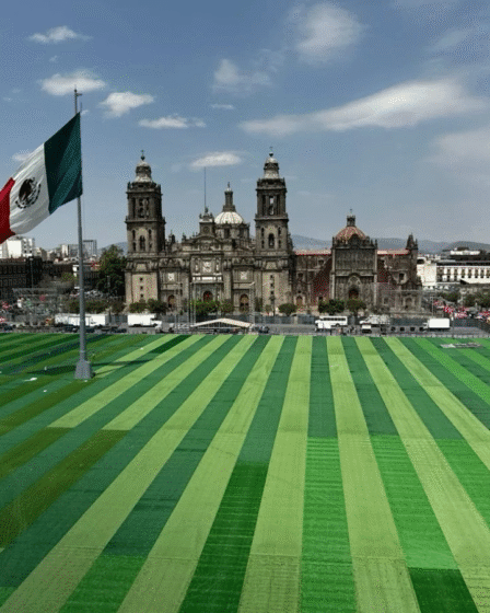 La Plaza de la Constitución fue cubierta con pasto sintético para albergar este domingo la clase de futbol más grande del mundo, con una meta …