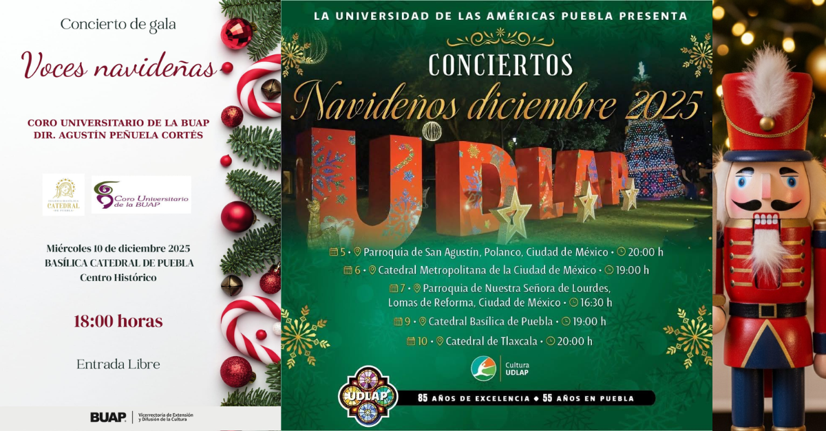 La BUAP también anunció su participación en la agenda decembrina con el concierto de gala “Voces Navideñas”, interpretado por el Coro Universitario bajo la dirección de Agustín Peñuela Cortés. La presentación se realizará el 10 de diciembre en la Basílica Catedral de Puebla, con entrada libre para la comunidad y visitantes interesados en disfrutar de piezas tradicionales de la temporada.